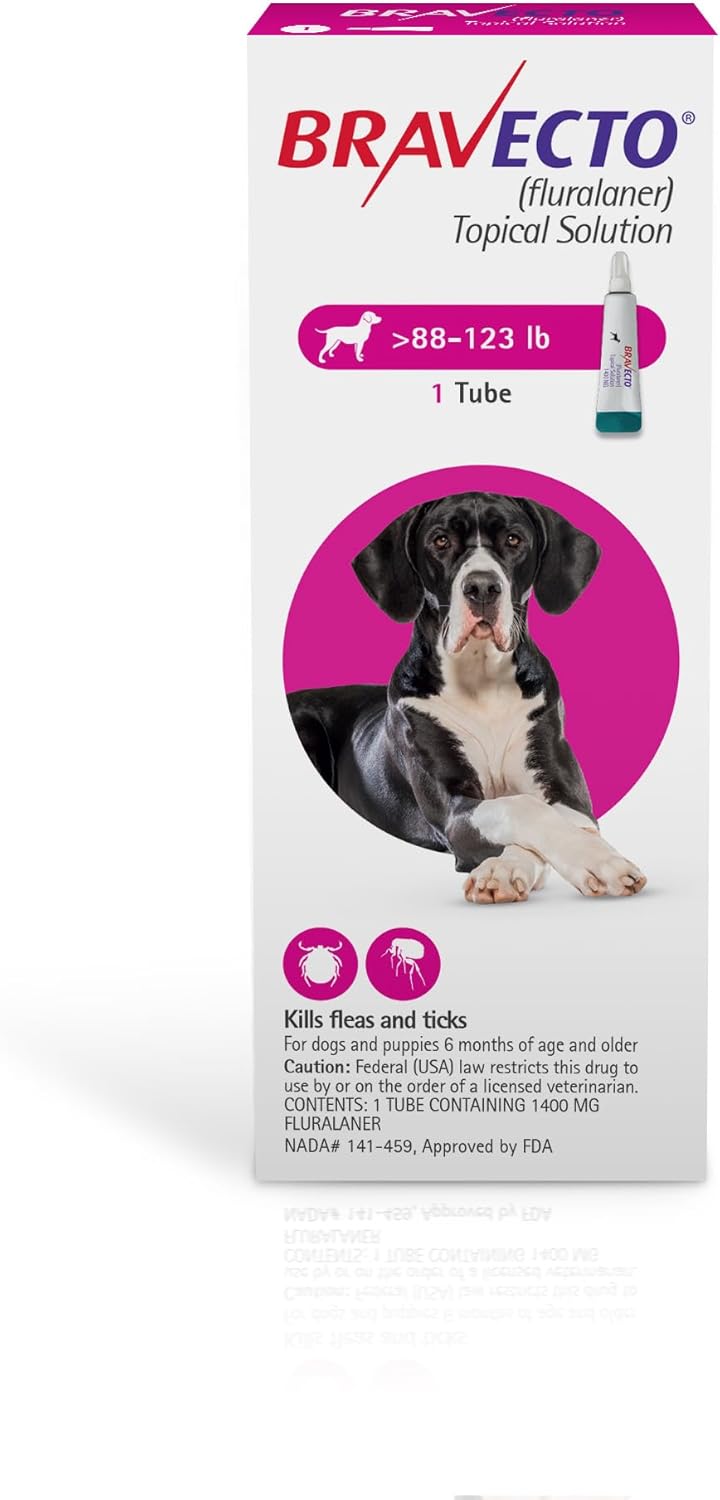 | Directions | Bravecto® Topical solution should be applied as directed by your veterinarian. This medication should be administered at every 12 week intervals, year-round to guarantee protection from fleas and ticks. For dogs over 123 lbs, use the appropriate combination of tubes to ensure complete protection against fleas and ticks. Immediately before use, open the pouch and remove the tube. Wear gloves. Hold the tube at the crimped end with the cap in the upright position (tip up). Leaving the cap on, turn it clockwise or couterclockwise one full turn. Do not remove the cap, the cap is designed to stay on the tube for dosing. Once the cap has been turned one full rotation the seal should break and it is ready for application. Always keep the tube in the upright position to prevent leaking. With the dog sitting or lying with its back horizontal, part the fur at the administration site. Place the tube vertically against the skin between the shoulder blades of the dog. Squeeze the tube and gently apply the solution in one or more spots starting between the shoulder blades and continuing along the dog's back. Avoid applying an excessive amount of solution in any one spot which may cause some to run or drip off the dog. Do not contact or allow children to contact the application site for 2 hours post application. Wash hands and contacted skin thoroughly with soap and water immediately after application. |