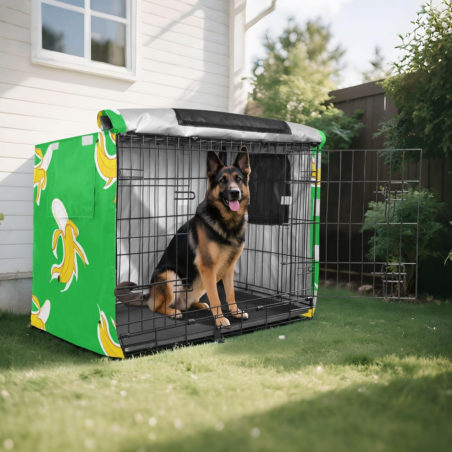 Protection – Made from 600D silver-coated oxford fabric, this breathable pet cage cover provides reliable protection against weather conditions, including wind and rain. It prevents your dog from scratching the crate and blocks harmful UV rays.Easy Installation – This cage cover features a user-friendly fastening system, allowing for quick installation without tools. It securely attaches to your dog crate, ensuring it stays in place for continuous protection.Effective Ventilation – Mesh windows on every side of the crate cover allow for steady airflow, keeping your dog comfortable and well-ventilated while inside. This design ensures your pet has a cool and breathable environment.Secure Fit – Equipped with four tie-down straps, the cover stays firmly in place, preventing it from shifting or being blown away. This added stability makes it suitable for outdoor use even in windy conditions.Ideal for Multiple Uses – This versatile kennel cover is Ideal for both indoor and travel use. Whether you’re at home, on a road trip, or camping, it offers a practical solution for protecting your pet’s crate.