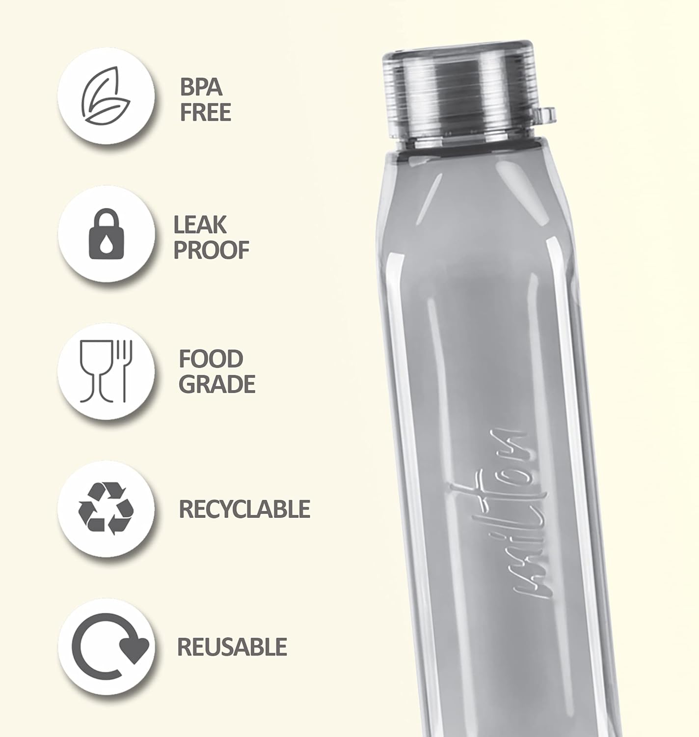 Keep the freshness alive with Milton's Prime PET bottles. They're made of BPA free, high quality food-grade, reusable material. This bottle makes it perfect for carrying with you on any day-trip or anywhere you go. It can be used at home, gym, work-related function, birthday party, or even just a brunch you’re hosting amongst friends, indoor and outdoor entertaining. When it comes to drinking fresh and clean water during travelling, it is best way to carry water from home to avoid any contamination. No matter where you go, you will never have to worry about carrying your water in a safe and secure manner again. The durable body makes them perfect for daily use. The best way to remind yourself to drink water is to carry a bottle with you and refresh yourself while travelling. This bottle is easy to clean and maintain, use a mild detergent or dish wash liquid and clean on the inside with a bottle brush. It is 100% leakproof, Food Grade, and Recyclable. Ideal for self use and gifting.